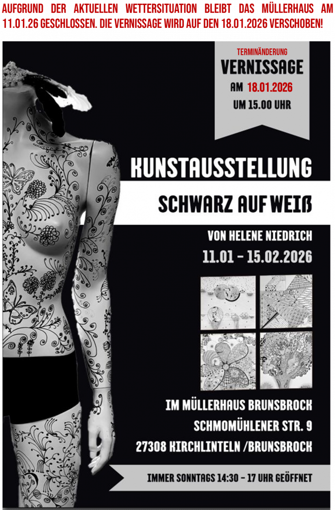 Aufgrund der aktuellen Wettersituation bleibt das Müllerhaus am 11.01.26 geschlossen. Die Vernissage wird auf den 18.01.2026 verschoben!