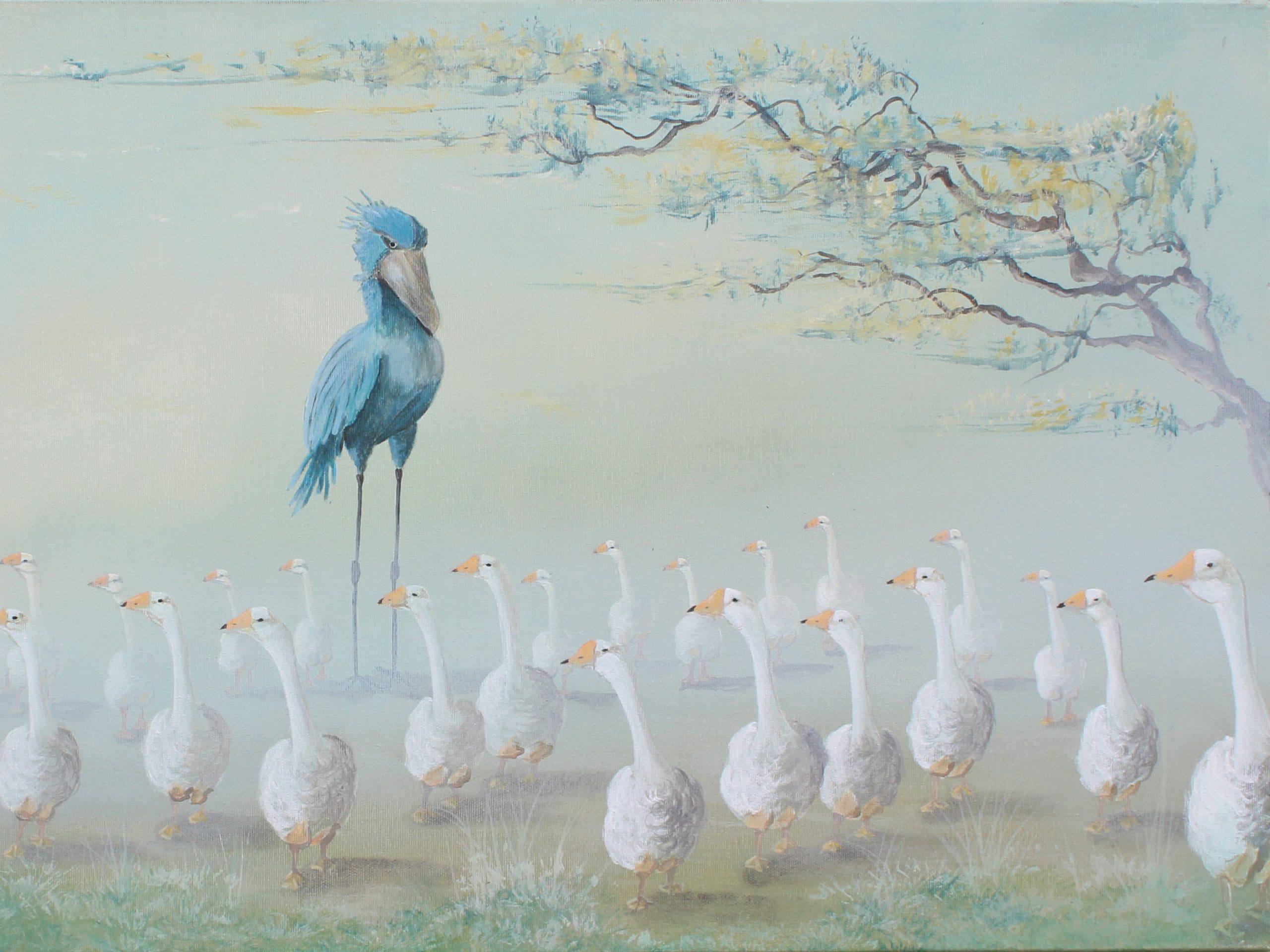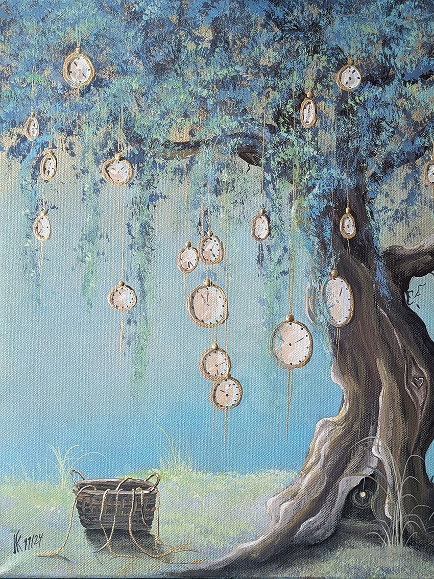 In „Nimm dir Zeit“ wächst ein Baum, dessen Zweige voller Uhren hängen – jede Uhr symbolisiert einen kostbaren Augenblick. Darunter steht ein Korb bereit, um genau die Zeit zu sammeln, die wir gerade brauchen. Mit diesem Bild möchte die Künstlerin eine Verbindung zwischen der Vergänglichkeit der Zeit und der Möglichkeit schaffen, sie bewusst zu gestalten. Es ist eine Einladung, sich der Fülle des Lebens hinzugeben, ohne sich in der Eile zu verlieren und dabei die eigene Welt in Farben und Gedanken neu zu entdecken.