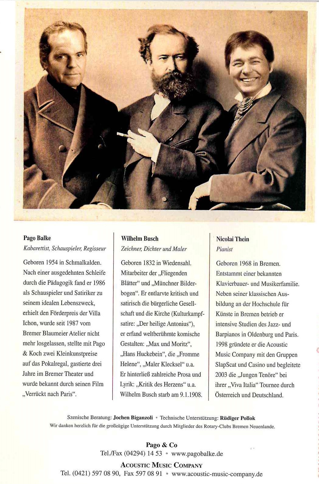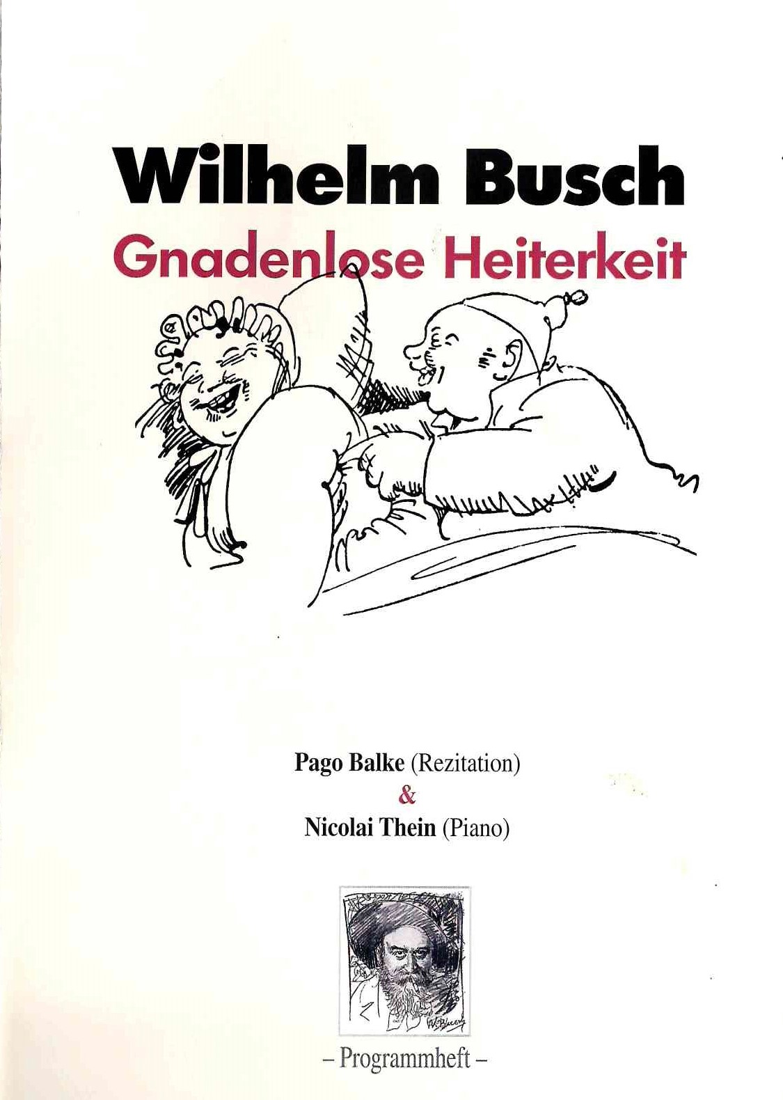 Die Begeisterung für WILHELM BUSCH, den genialen Humoristen, Dichter und Zeichner hat die beiden Künstler PAGO BALKE und NICOLEI THEIN zusammengeführt. Sie haben mit diesem abendfüllenden Programm – knapp 100 Jahre nach seinem Tod – einige Perlen seiner Kunst wieder entdeckt und mit Text, Bild und Musik zu neuem Leben erweckt
