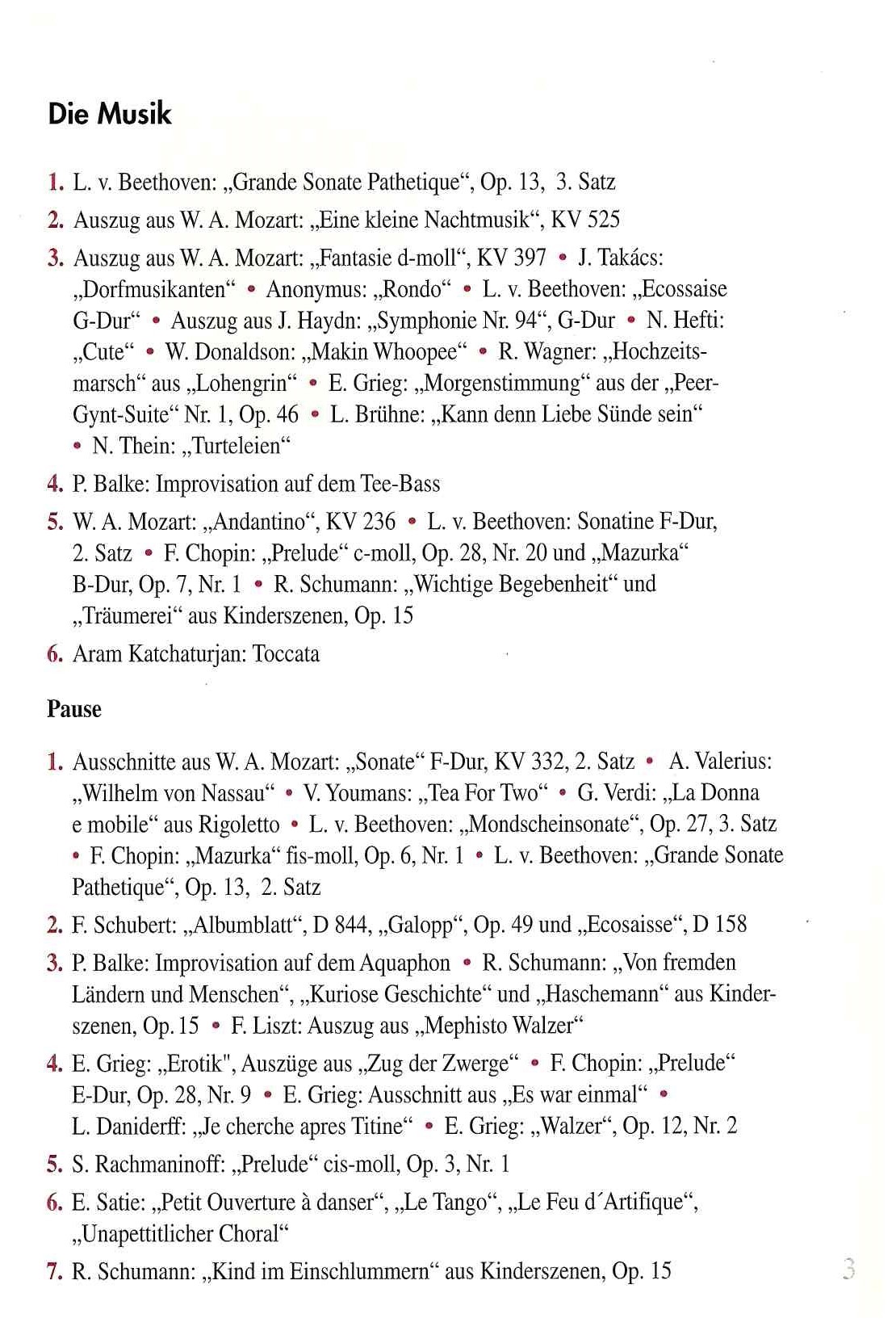 WILHELM BUSCH hat mehr als Max und Moritz hinterlassen und Sie werden an diesem Abend Balduin Bählamm, dem verhinderten Dichter begegnen, dem Junggesellen Tobias Knopp, Maler Klecksel, diversen Basen, Tanten, Virtuosen, feindlichen Nachbarn und einem Affen namens Fips. Begleitet und kommentiert am Klavier mit Musik von Mozart bis Rachmaninoff, von Satie bis Charlie Chaplin.