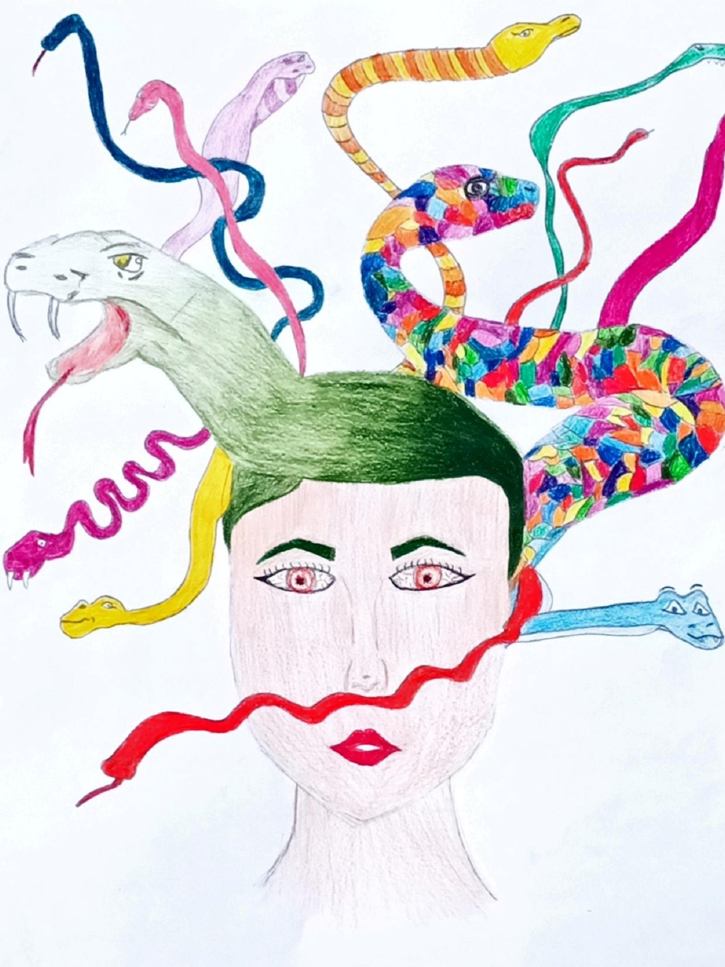 Kreative Schülerinnen und Schüler präsentieren in ihrer Ausstellung eine breite Palette an Sujets, wie Portraits, Landschaften, Dreidimensionalität, einfache raumschaffende Mittel, inszenierte Fotografie und vielfältige künstlerische Techniken, z. B. Schraffur und Struktur, Collage, Frottage, Deck- und Wasserfarben, Öl- und Pastellkreiden, Graphit- und Buntstift, Materialkombinationen und plastisches Gestalten.
