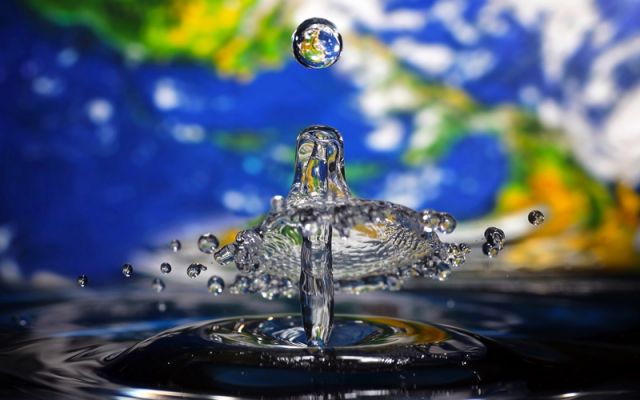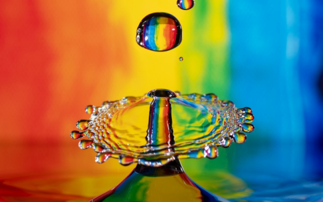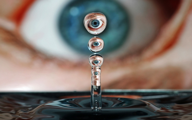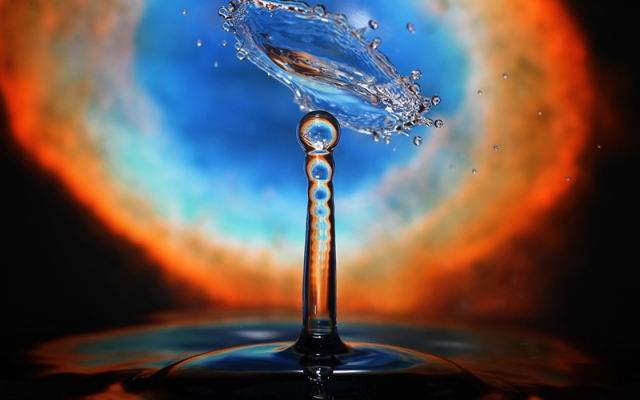 Durch ihre Fähigkeit das Licht zu brechen, können Tropfen für kurze Augenblicke wie Linsen wirken und einen sonst unscharfen Hintergrund fokussieren. Um diese Momente einzufangen muss man allerdings einige Faktoren kontrollieren können. Den Hintergrund druckt er auf Fotopapier aus und platziert ihn außerhalb des Kamerafokus verkehrt herum hinter dem Tropfen und beleuchte ihn mit einem Blitz. Die Tropfengröße und Abwurfzeit sowie das Auslösen der Kamera und des Blitzes