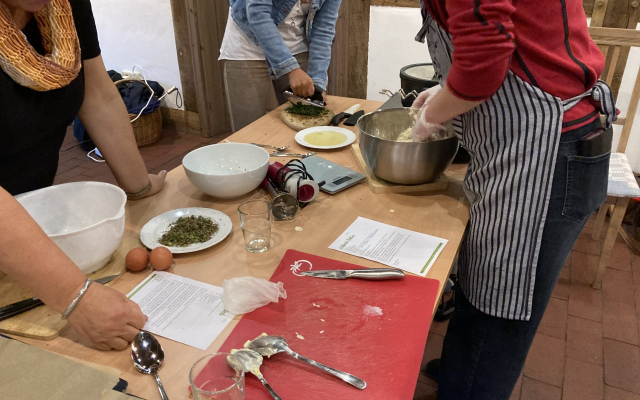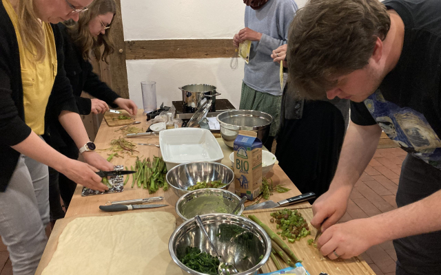 Für das Kochen bitte Küchenmesser (klein, groß) und Holzbrett mitbringen.